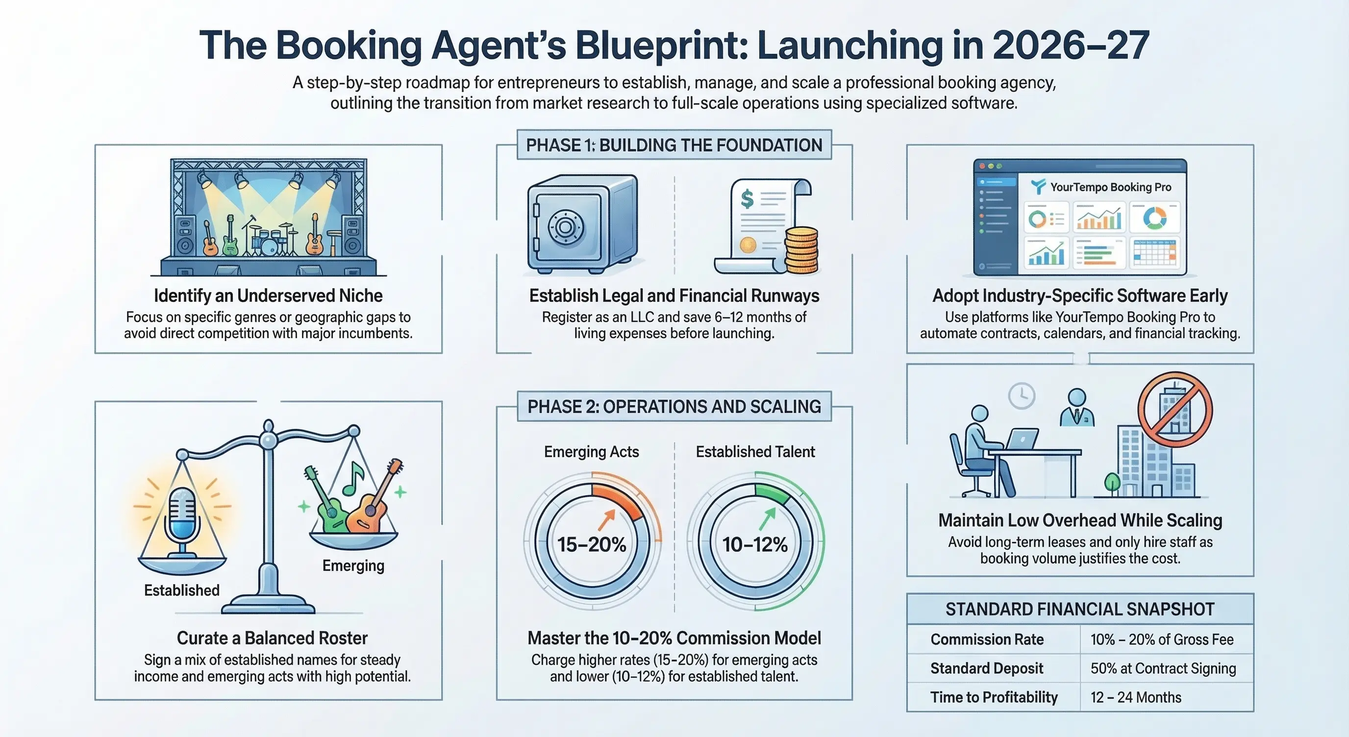 Treat your agency like any other business. Write a concise business plan that outlines your service offerings (e.g. booking only, or booking plus tour support, marketing, etc.), target clients (which artists and buyers you’ll focus on), and revenue model. Commission rates typically range from 10–20% of performance fees; emerging artists often pay higher rates (15–20%) in exchange for more effort by the agent, while established acts negotiate lower rates (10–15%). Set clear financial projections: list anticipated expenses (software, travel, insurance) and realistic booking volumes. Keep in mind new agencies may take 12–24 months to become consistently profitable.